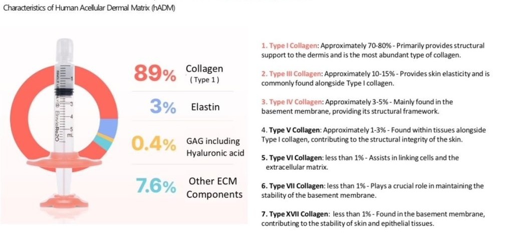 An ECM-based formulation developed from hADM is commonly used as a skin booster in Singapore to support overall skin quality. It begins as donated dermal tissue and retains the structure of the natural extracellular matrix after processing. Once prepared, the matrix contains components that exist in the deeper layer of the skin, supporting hydration, elasticity, and overall skin resilience.
